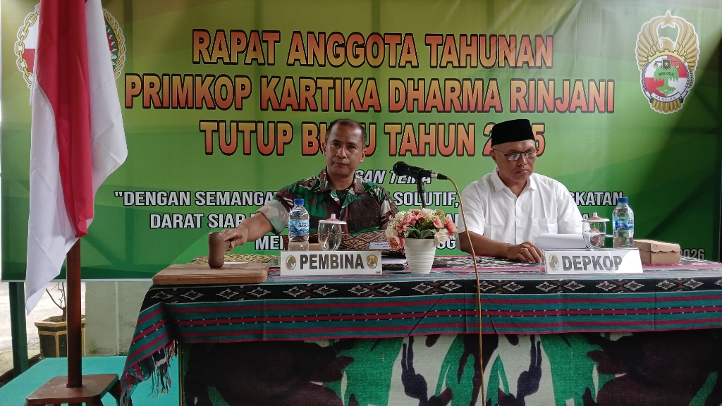 Mataram, NTB – Semangat kebersamaan dan komitmen membangun kemandirian anggota terasa kuat dalam Rapat Anggota Tahunan (RAT) tutup buku tahun 2025 Primer Koperasi (Primkop) Kartika Dharma Rinjani yang digelar di Markas Komando Distrik Militer (Kodim) 1606/Mataram, Jalan Pejanggik Nomor 7, Jum’at (13/2/2026) siang.
