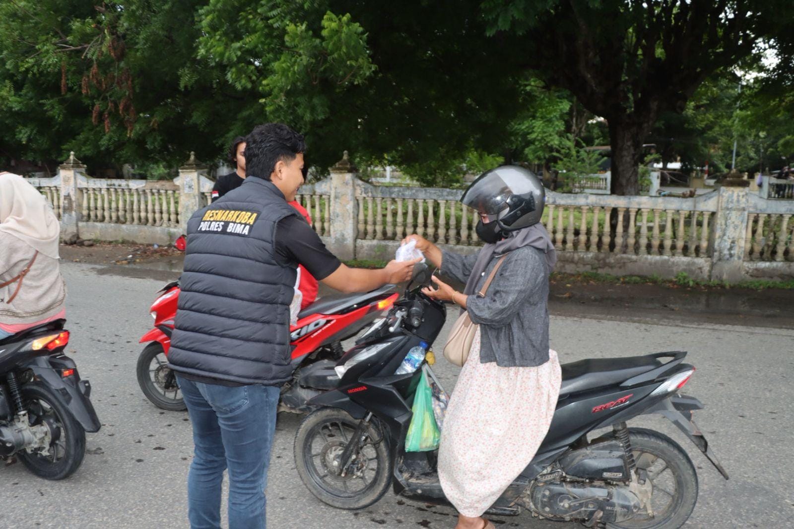 Momen hangat menjelang berbuka puasa Satuan Reserse Narkoba Polres Bima Kabupaten jajaran Polda NTB membagikan takjil bagi para pengendara roda maupun roda empat yang melintas di depan Mapolres Bima Kabupaten