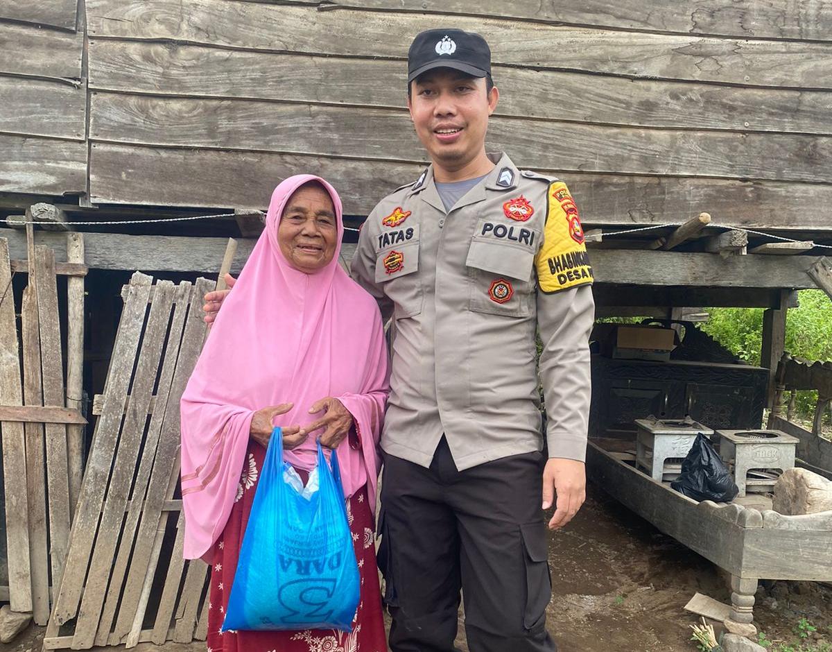 Bhabinkamtibmas Desa Piong Polsek Sanggar Polres Bima Kabupaten Polda NTB Briptu Tatas Saputra menyalurkan bantuan paket sembako kepada Warga lansia Kurang mampu di Desa Binaannya.