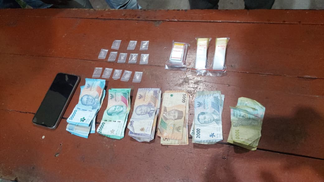 Dalam proses penggeledahan yang disaksikan oleh masyarakat umum serta perangkat desa setempat, petugas menemukan barang bukti berupa 13 poket narkotika jenis sabu dengan berat bruto 2,81 gram, satu unit handphone merek Oppo, serta uang tunai sebesar Rp326.000.