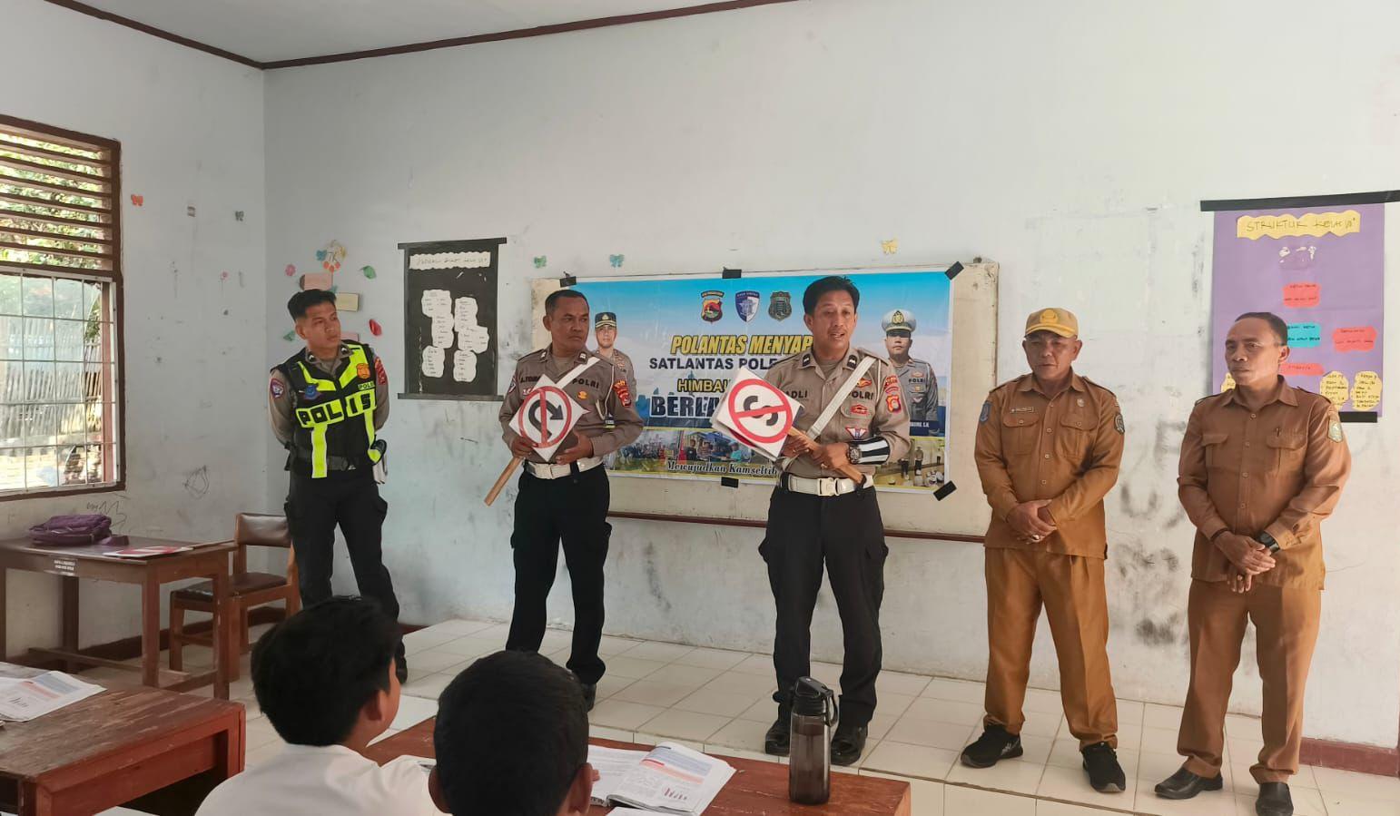 Mengantisipasi terjadinya kecelakaan di kalangan pelajar, Satlantas Polres Bima Kabupaten Polda NTB menyambangi SMP Negeri 1 Palibelo dalam Program Police Go to School Senin 13 April 2026. Pagi.
