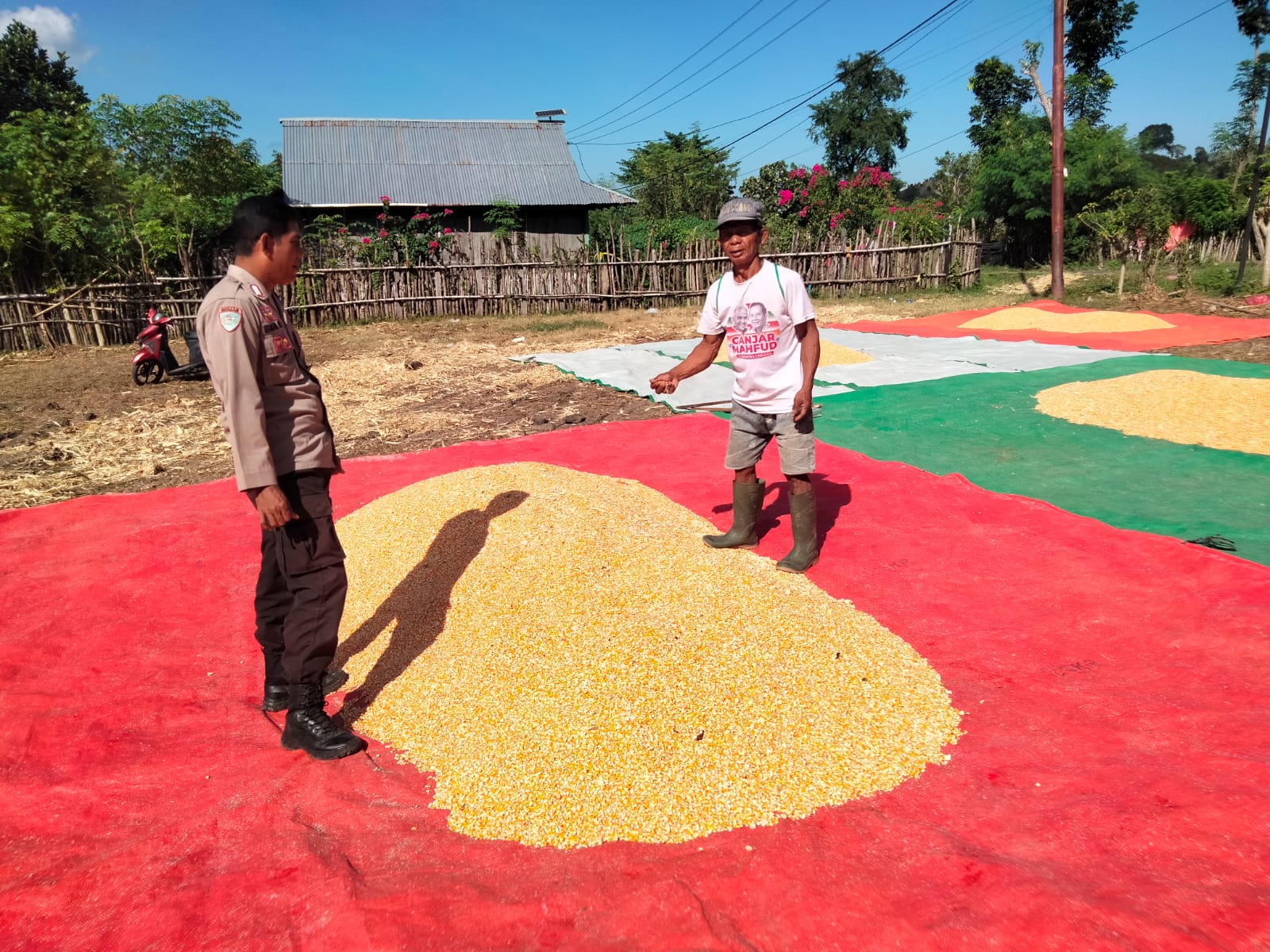 Dalam rangka mendukung Program Ketahanan Pangan Nasional menuju Indonesia Emas 2045, Bhabinkamtibmas Desa Cempi Jaya Polsek Hu’u melaksanakan pemantauan terhadap hasil panen jagung milik warga binaan yang sedang dijemur di wilayah Kecamatan Hu’u, Kabupaten Dompu.