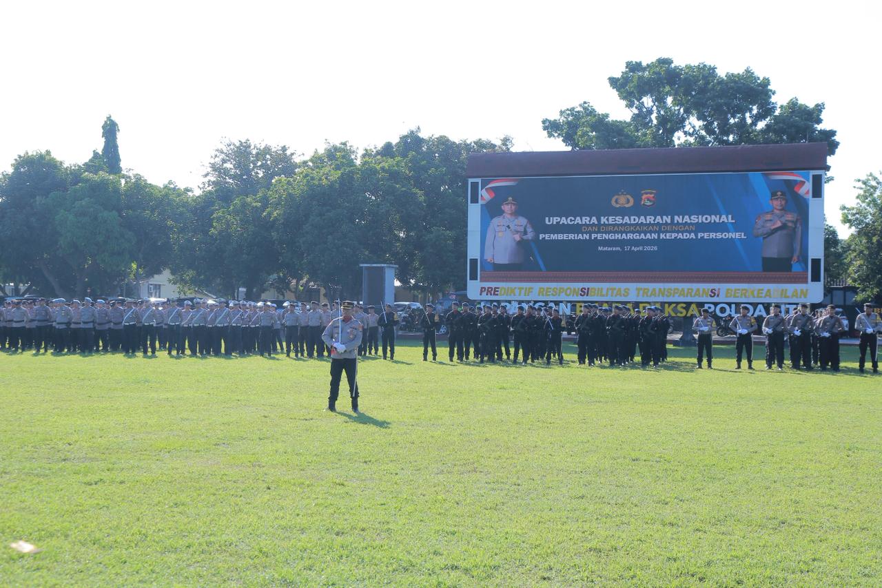 Mataram, NTB – Kapolda NTB Edy Murbowo memimpin upacara peringatan Hari Kesadaran Nasional yang dirangkaikan dengan penyerahan piagam penghargaan kepada personel berprestasi di lingkungan Polda NTB, Jumat (17/04/2026).