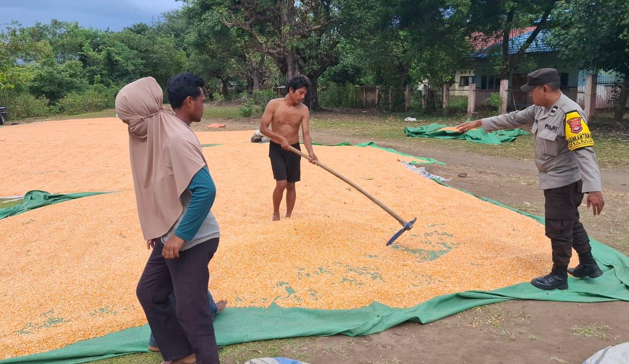 Senin 20. April 2026 sekira pukul 15.00. Wita Aipda Arif PW.S.sos membantu menjemur dan mengumpulkan jagung petani di Desa Bajo.